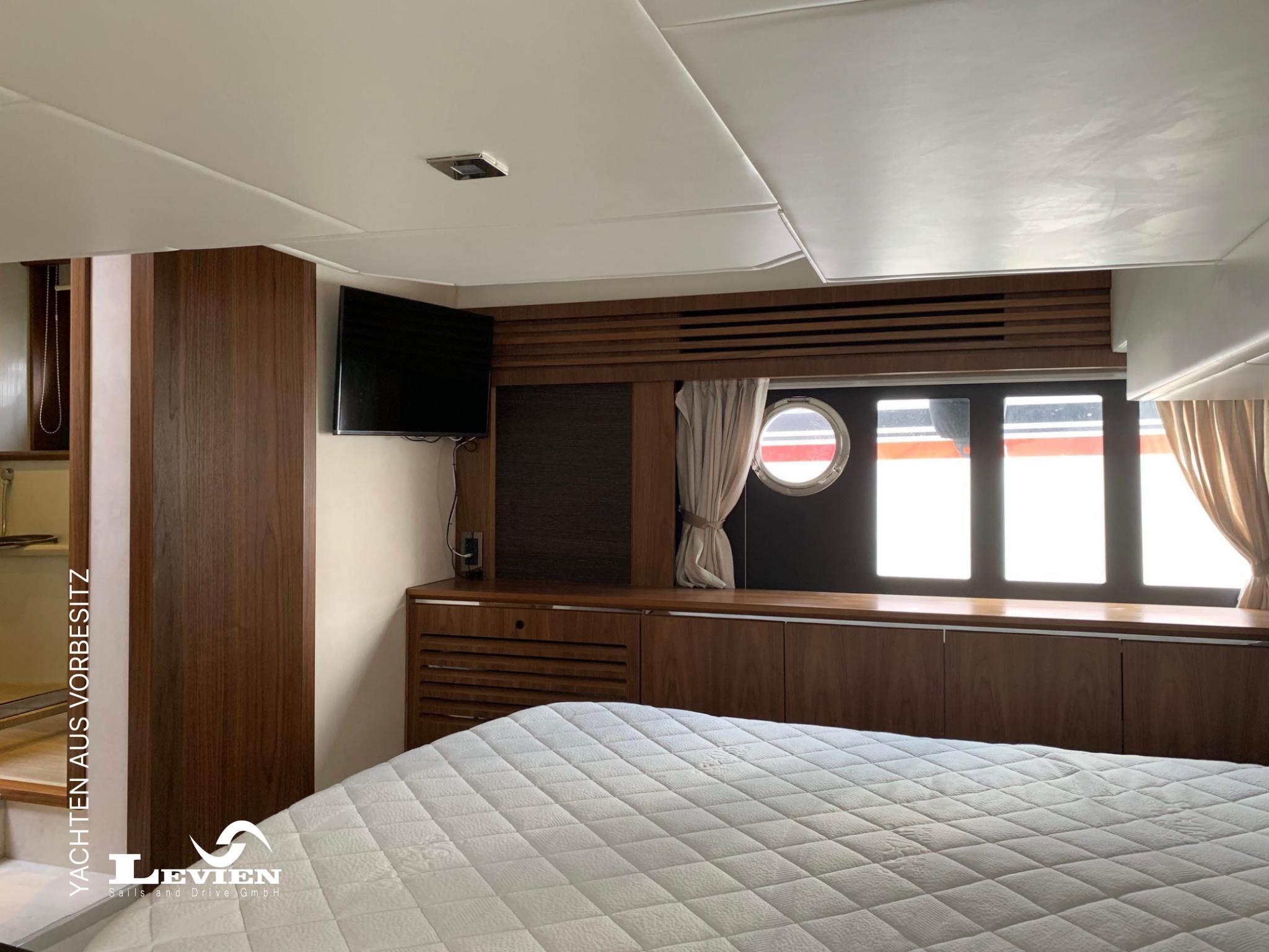 - Inneneinrichtung aus Canaletto-Nussholz, Ledercouch, Hochglanz lackierte Bettumrandung in der Farbe Sand, Kopfenden der Betten aus dunkelbraunem Edelholz